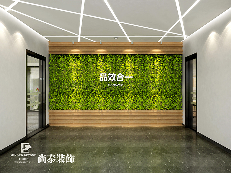 前臺大廳區(qū)域,主要設(shè)計門面與造型天花來凸顯時尚,入戶后墻面的綠植設(shè)計總能讓人百看不厭,配合軌道射燈的燈光效應(yīng),哪怕是在夜晚,都能讓人眼前一亮。吊頂天花的設(shè)計,通過線條感來體現(xiàn)科技感,墻面與天花大部分的刷白,直接與背景墻形成一個鮮明的對比,直接讓背景墻“跳”了出來。