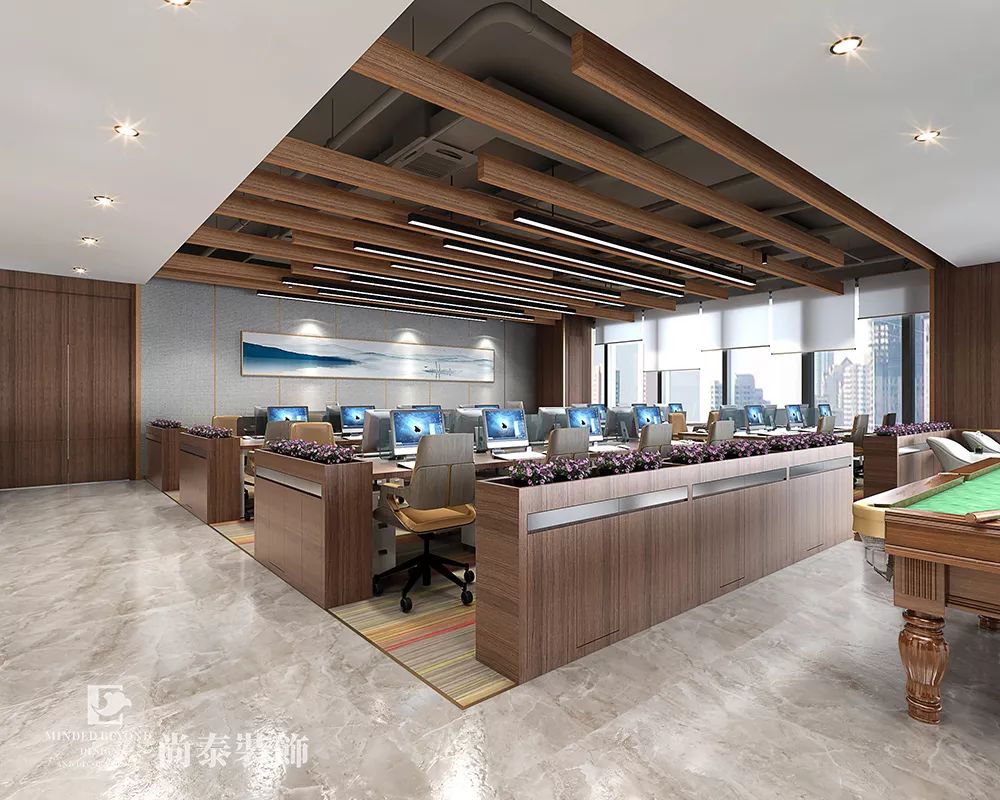 開放辦公區(qū)域仍然以大理石地板為底,但是又多做了軟化處理,在員工們的辦公區(qū)域鋪設(shè)了相近色的地毯,使得環(huán)境沒有過于生冷。員工們的休閑生活往往是簡單而隨性的,所以在休閑區(qū)域內(nèi)設(shè)計了桌球,桌球這項運動是國際上廣泛流行的室內(nèi)高雅運動,下班時間打打桌球無疑是很輕松愜意的。
