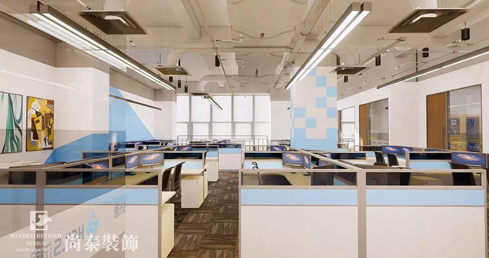 會議室功能區(qū)位置偏里面,采用直線性的照明設(shè)計,保證會議區(qū)的照明效果,在空間墻體上也采用了亮色的藍(lán)色和裝飾畫點(diǎn)亮空間。