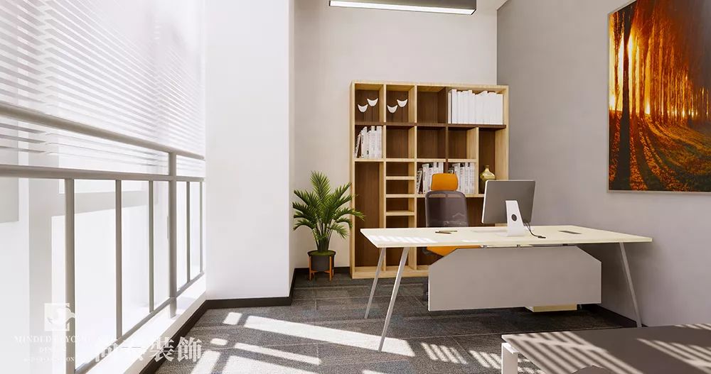 獨(dú)立辦公室靠窗,剛好是采光很充足的那一邊,所以采用百葉窗設(shè)計柔和了強(qiáng)烈的光照直射。空間風(fēng)格和整體空間一樣簡約,不規(guī)則格局的書柜和綠植等軟裝裝飾,給空間增添潔凈舒適感。